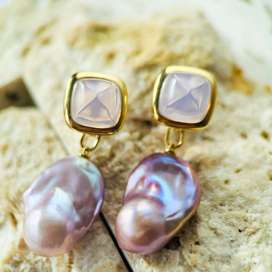 18K Gold Sugar Loaf Cut Lavender Amethyst Baroque Pearl Earrings