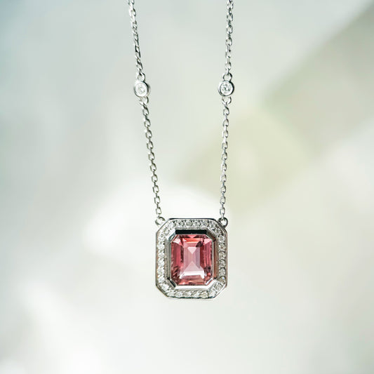 18K White Gold Cherry Blossom Pink Tourmaline Diamond Necklace