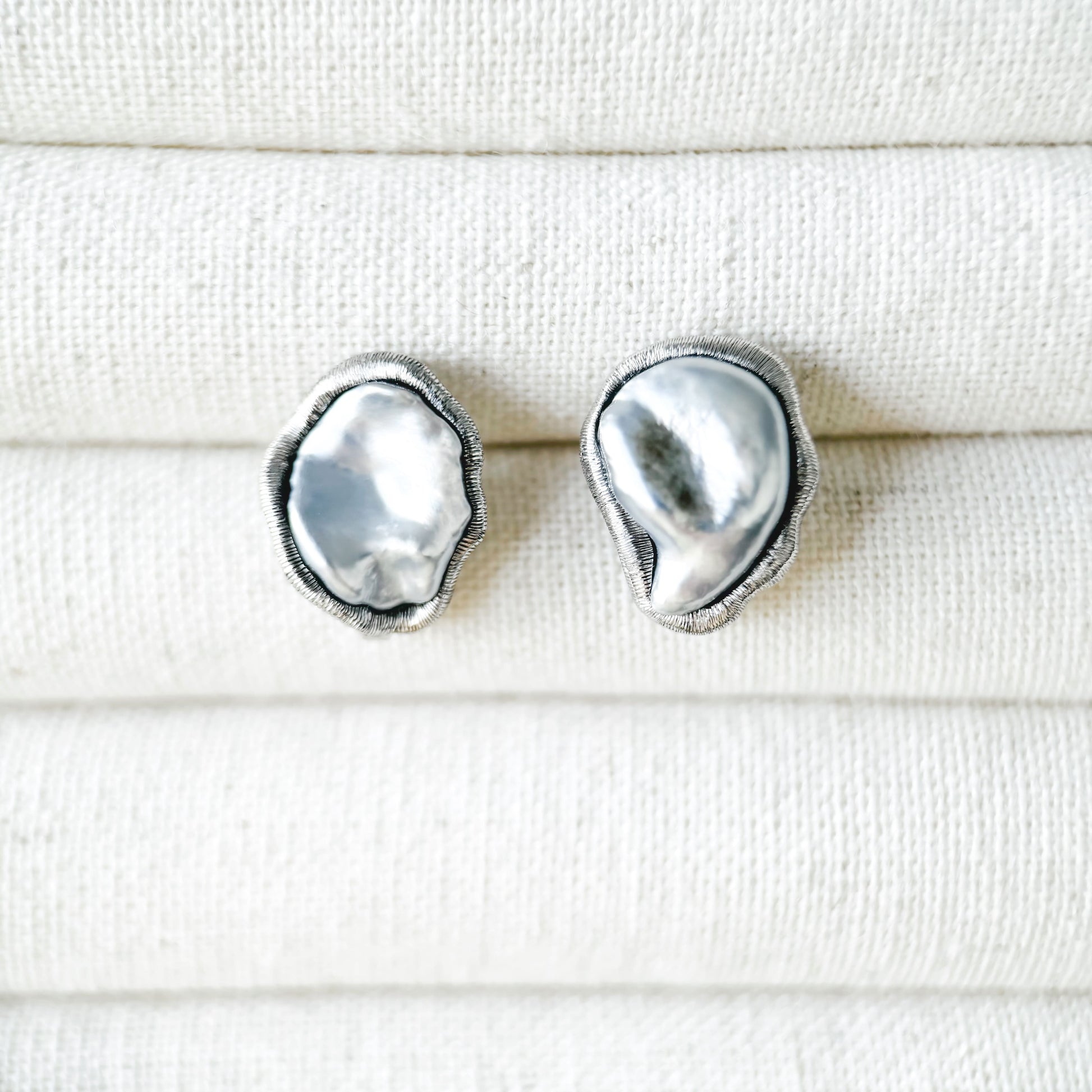 This unique and exquisite pair of earrings blend various luxurious elements, showcasing exceptional jewelry craftsmanship. Carefully selected Tahitian silver-blue Keshi pearls exhibit a distinctive petal-like shape, complemented by fine hand-drawn detailing around each drop-shaped Swiss blue topaz. A sparkling diamond adorns each topaz, adding a touch of luxury to the overall design.