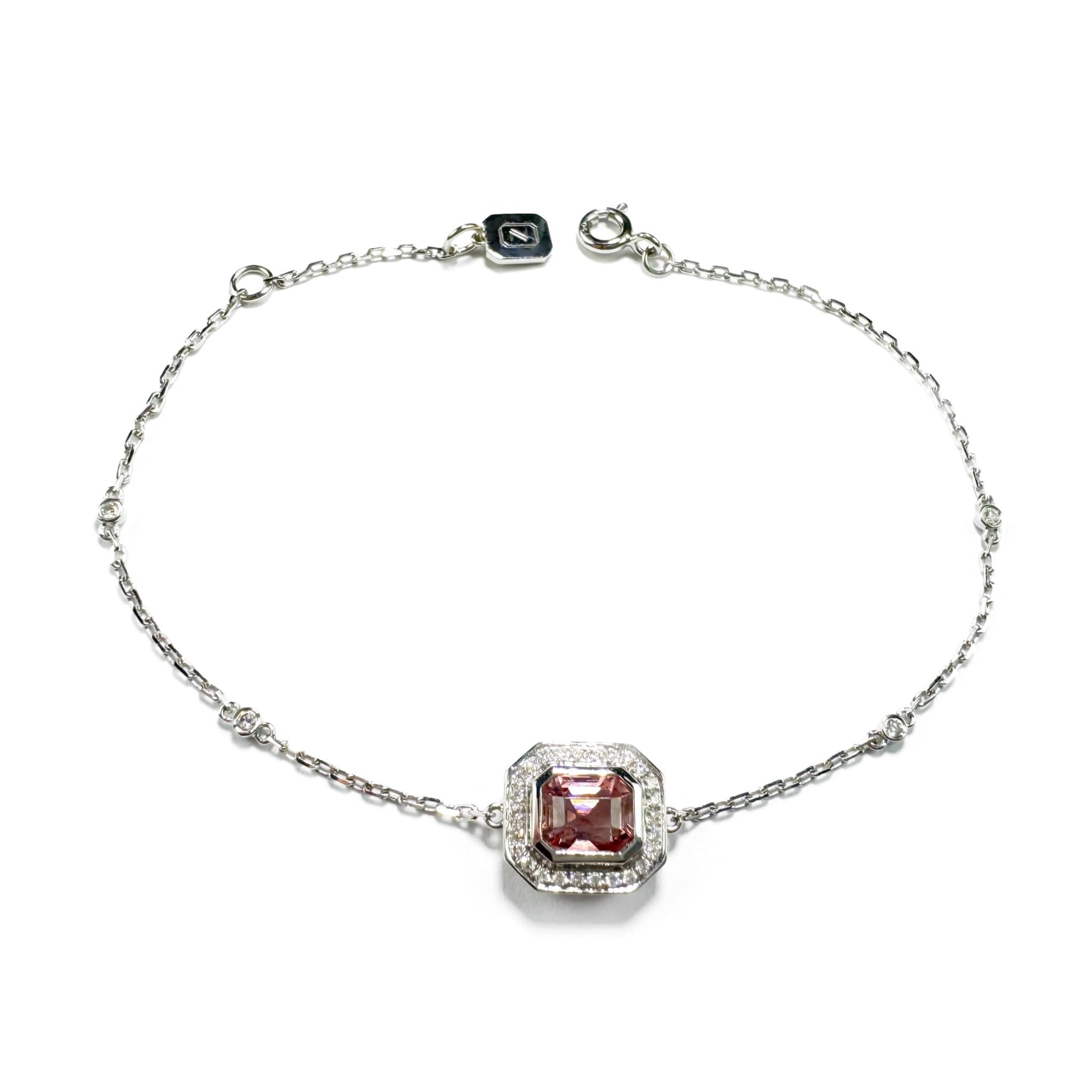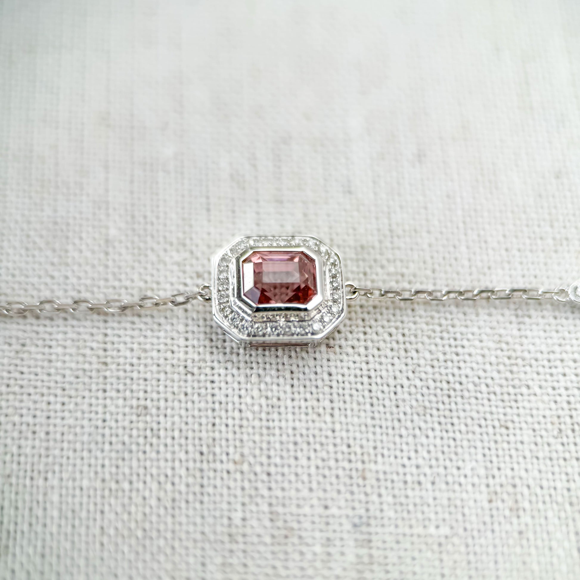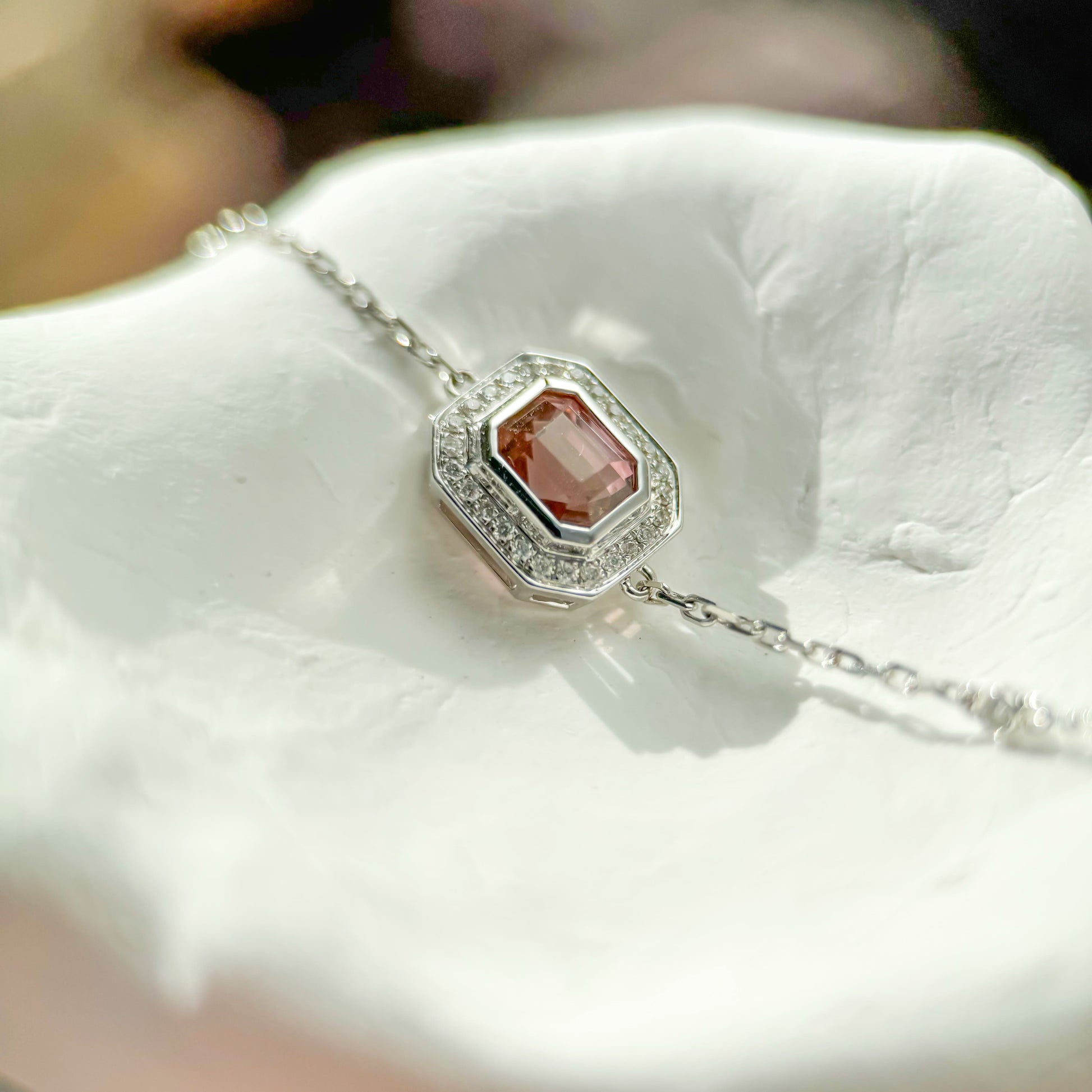 This bracelet continues the design philosophy of the same series necklace, offering a perfect extension of simplicity and elegance. The Granny Green-cut cherry blossom pink tourmaline on the bracelet showcases magnificent brilliance, expertly embedded into 18K white gold with exquisite craftsmanship. Diamonds delicately surround the tourmaline, resembling blooming cherry blossoms, creating a dazzling and radiant effect. The bracelet's design is uniquely thoughtful, adorned with two diamonds on one side, injecting a touch of luxury and sparkle into the overall aesthetic. The length of the bracelet is adjustable, significantly enhancing its versatility. Wearing this bracelet is like entering a fairyland of dancing cherry blossoms, experiencing a light and glamorous atmosphere. Whether for daily wear or special occasions, this bracelet will add a brilliant touch to your overall style.