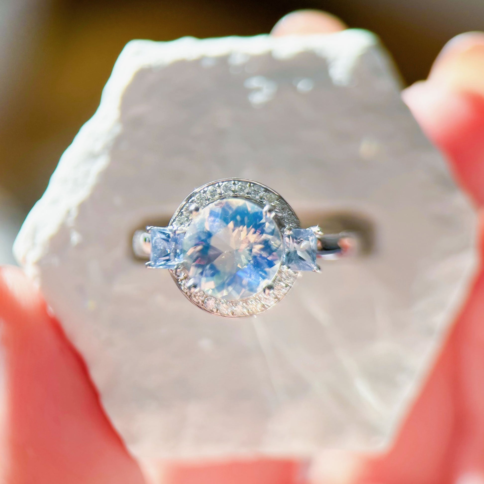 Materials: 18K white gold, 1.71ct faceted natural Rainbow Moonstone, 0.6ct natural blue sapphires, 0.16ct natural diamonds