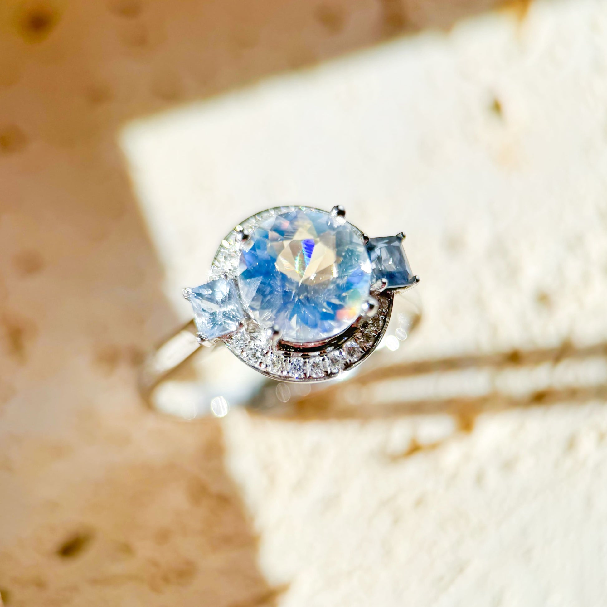 This exquisite ring features a natural Rainbow Moonstone as the main gemstone. The unique optical effects of Rainbow Moonstone create a spectacular spectrum of colors when exposed to light, resembling the pouring down of a celestial rainbow. The ring's design is chic, with two princess-cut blue sapphires adorning each side of the band, adding a touch of fresh blue to the overall style. Diamonds cleverly encircle the main stone, sparkling brilliantly and infusing the entire design with luxury and radiance.