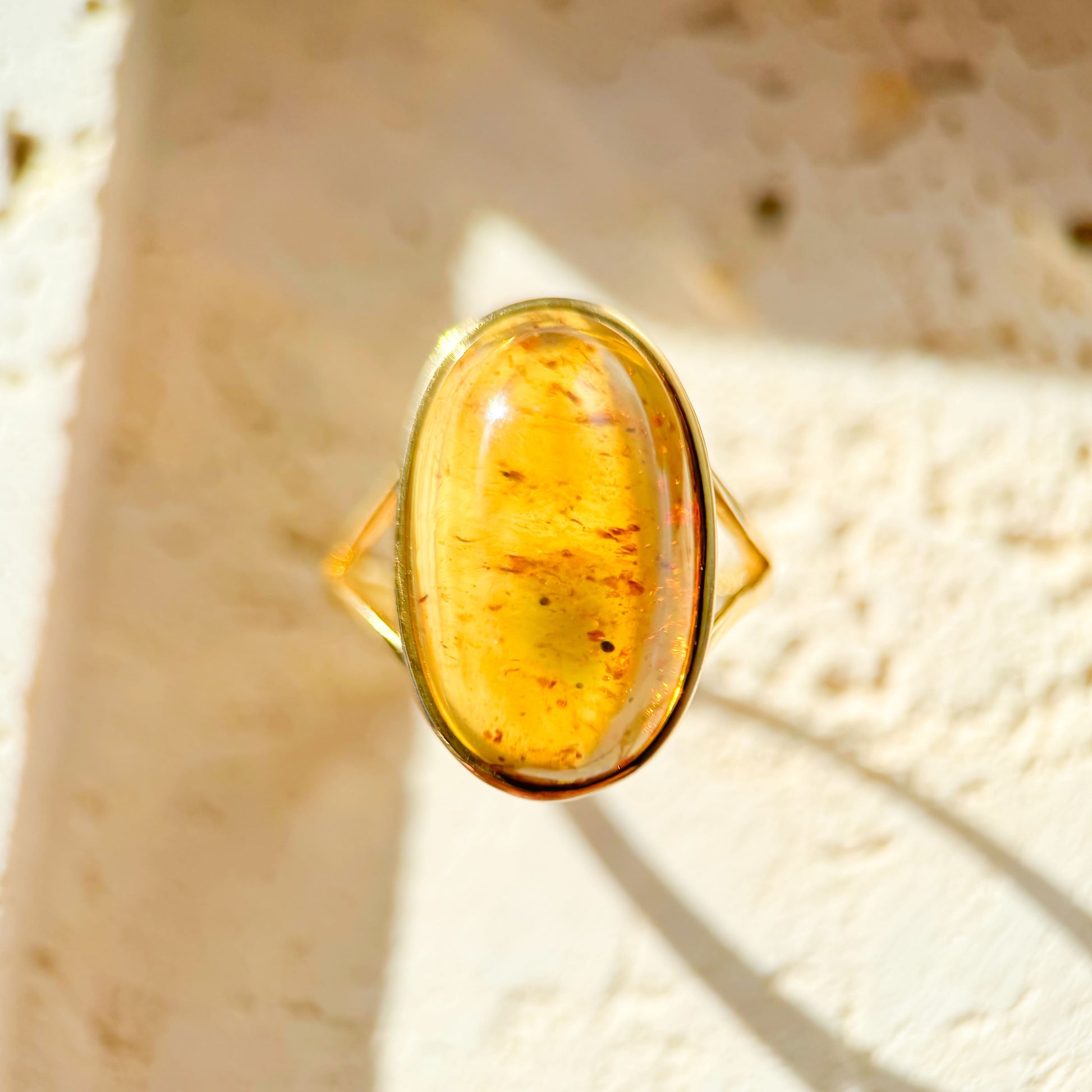 The main stone of this ring features a Dominican Blue Amber with a natural burst, its internal burst shining brilliantly in the sunlight, resembling fireworks under the evening sun. The main stone is meticulously handcrafted from a single piece of Dominican Blue Amber, with a mirror-polished surface. The warm hues of amber, paired with the minimalist design, make this ring versatile, suitable for various styles and occasions in everyday wear.